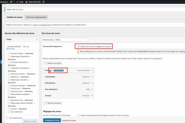 Pour créer un méga menu professionnel sur WordPress, commencez par installer ElementsKit (compatible Elementor), insérez le widget “Nav Menu” dans votre en-tête, activez l’option “Mega Menu” sur chaque élément parent depuis Apparence > Menus, puis personnalisez le contenu en colonnes avec icônes, listes et liens. Ajustez la largeur, les couleurs et les effets au survol pour un rendu moderne et responsive, idéal pour la création de site internet ou la refonte de site web.